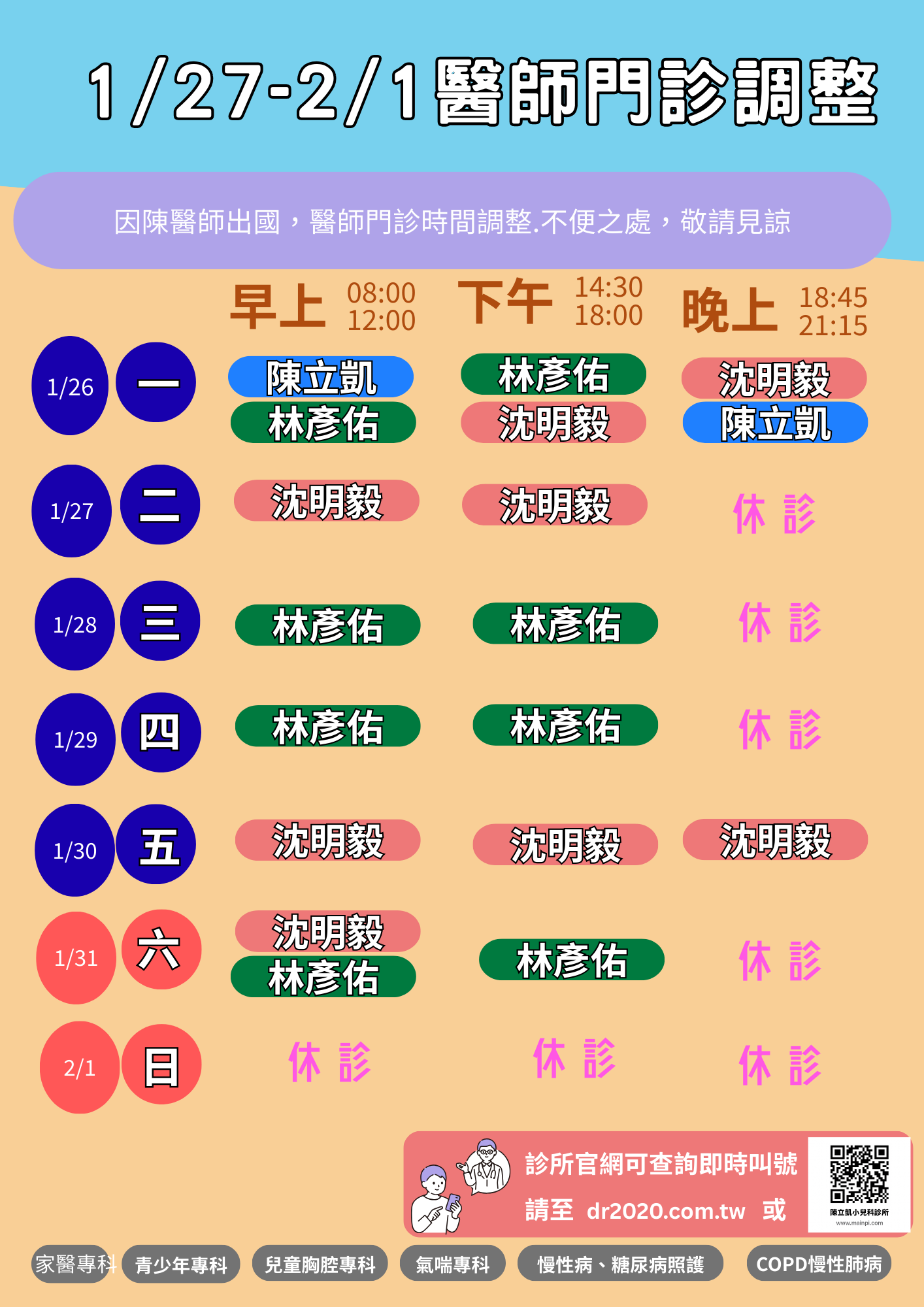 2026年1/27-2/1陳 醫師出國,